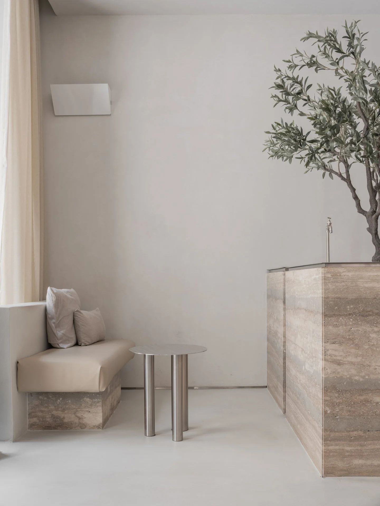 The second hall tucked deeper inside, is illuminated by a dynamic wall panel that mirrors natural light shifts throughout the day. Here, you’ll find our Gropius chairs and Flock lounge chairs with ottomans, whose soft, rounded shapes harmonise with the architectural curves of the walls and niches.