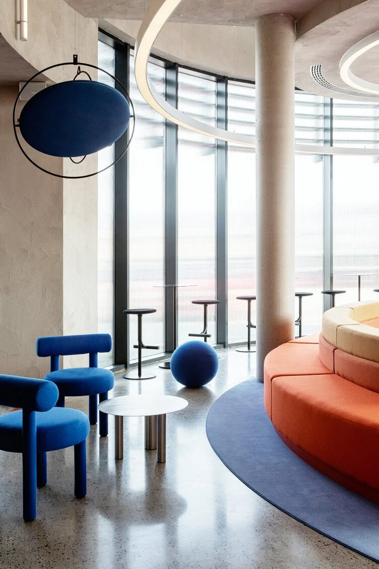 NOOM's accent Gropius chairs in cobalt blue upholstery, round cushions, ottomans, and stainless steel Brand coffee tables played a pivotal role in enhancing the unique space at Sonica's HQ. These elements are seamlessly integrated into the design, adding playful sophistication and comfort to the plush, deep blue lounge.